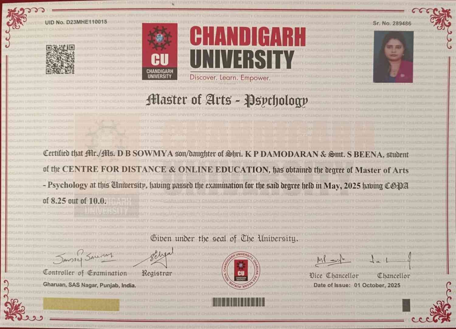 Ms. D. B. Sowmya is a Master of Arts (MA) graduate in Psychology from Chandigarh University (NAAC A+ Accredited), completed . She has a strong academic foundation in psychological theories, human behaviour, and mental health principles. Her professional orientation reflects a commitment to ethical practice, continuous learning, and evidence-based psychological approaches. She is keen on applying psychological knowledge responsibly in clinical, counselling, and wellness-oriented settings.