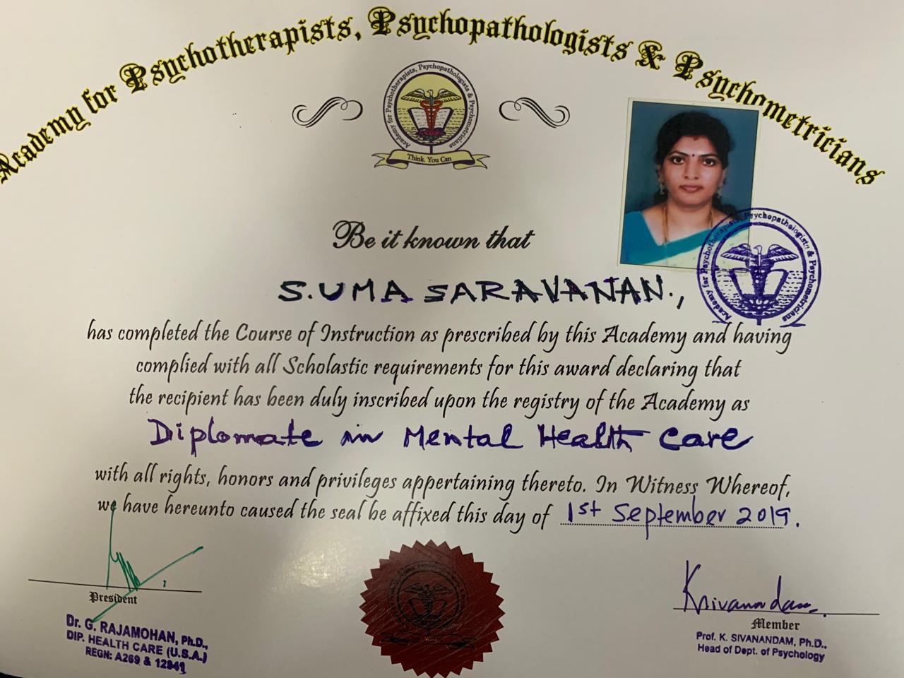 I am a Psychologist, have done a year programme in Counselling with Transactional Analysis framework, Completed Diploma in School, Corporate and Family Counselling. I have also certified in Cognitive Behavioural Therapy and Neuro-Linguistic Programme both Basic and Advanced. Trained in Client-centred Therapy too.